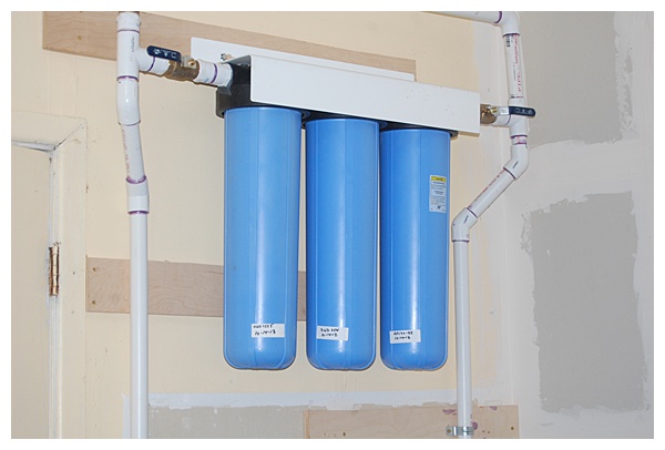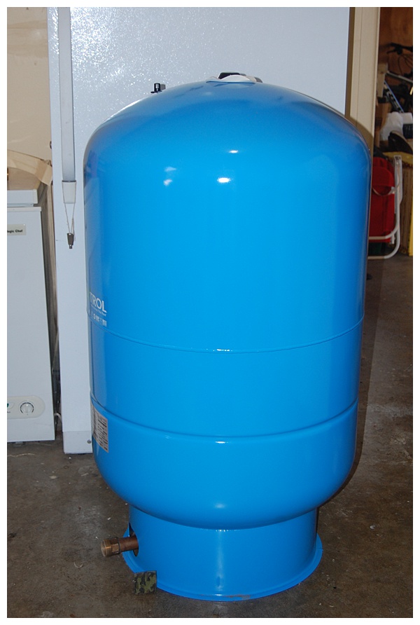 Here are the new parts, the 86 gallon pressure tank and the 3-stage water filters. We had also experienced some sediment in our water, especially after the power would go out, or whenever we had to shut off the pump. When it would start back up and bring back up water to an empty system it would bring in fine particles that would settle in the toilet tank and faucet screens. Not anymore! Our new filters progressively remove sediment down to 1 micron, and there is a carbon filter to remove any unwanted tastes or odors. The carbon filter was probably unncessary as our water has always tasted great, but I figured what the heck, why not?
