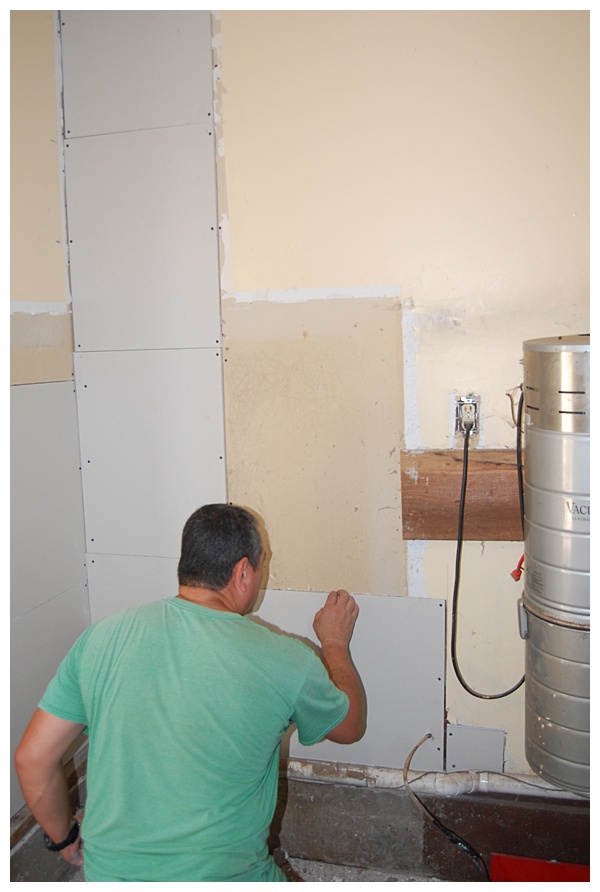 And on the inside we patched up all the old drywall with patches and taped off the seams. I didn’t want to take the time to paint it, that would have required painting the whole room, and I honestly wanted to just do a water project, not an entire garage rehab. We will eventually paint it though.