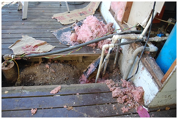 Here is tearing out the old plumbing. There were pipes going everywhere, splices, elbows, this was a water system that evolved over 3 decades, and clearly had been added onto every few years with another splice. What a mess. We would need to remove everything existing and start from scratch.