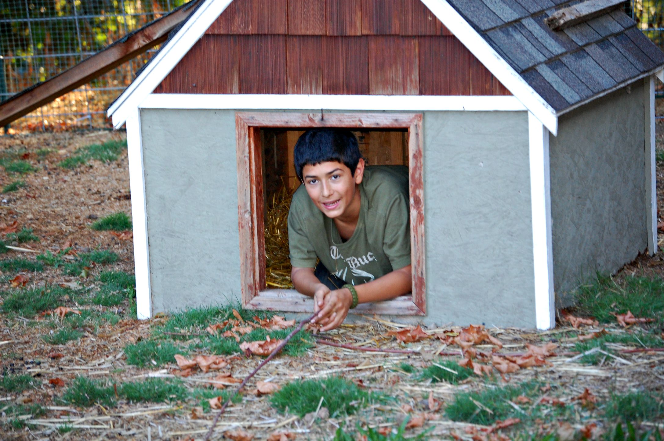 Once they found that spot they began to search high and low. The dog house for the goats was the next jack pot. Joshua, always willing to climb in small places, found the nest in the back corner.