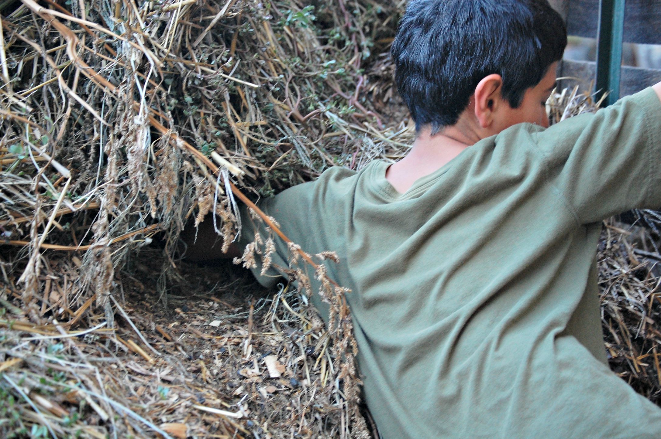 It was sheer luck that Michael noticed a chicken walking down the back side of one of the compost piles and a few eggs that tumbled down behind her. Ah ha! They went to the back side if the compost bin and noticed a hole in the pile. The hole was obvious. What wasn’t obvious was how far back it went. Joshua had to put his whole arm in there to reach the eggs. I guess chickens don’t mind laying an egg in a hot, stifling, dark space.