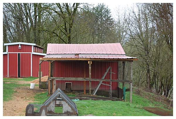 There we go! Our pampered chickens have a place to get out of the rain but still peck around for food.