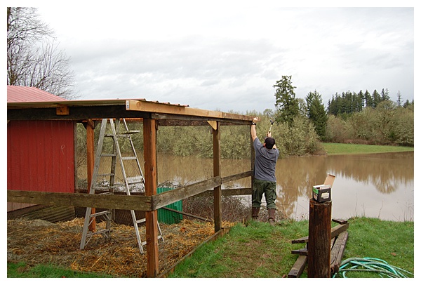 Way back in February of 2015 Michael thought the outside fenced in area of the chicken coop needed a top so the chickens would have a dry place to search for bugs and other things to eat without getting all wet.