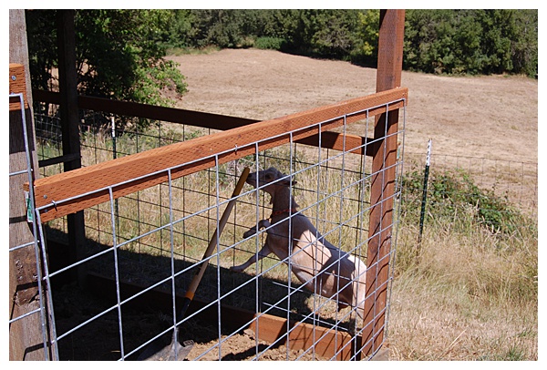 There is Sandy trying to scratch herself with the handle of the shovel. As mentioned before, they also liked to rub against the chicken wire to scratch themselves. So, we put a exterior layer of cattle panels on the coop to protect the chicken wire from the goats rubbing and scratching. Scratch all you want you silly goats, you cant destroy our chicken wire now!