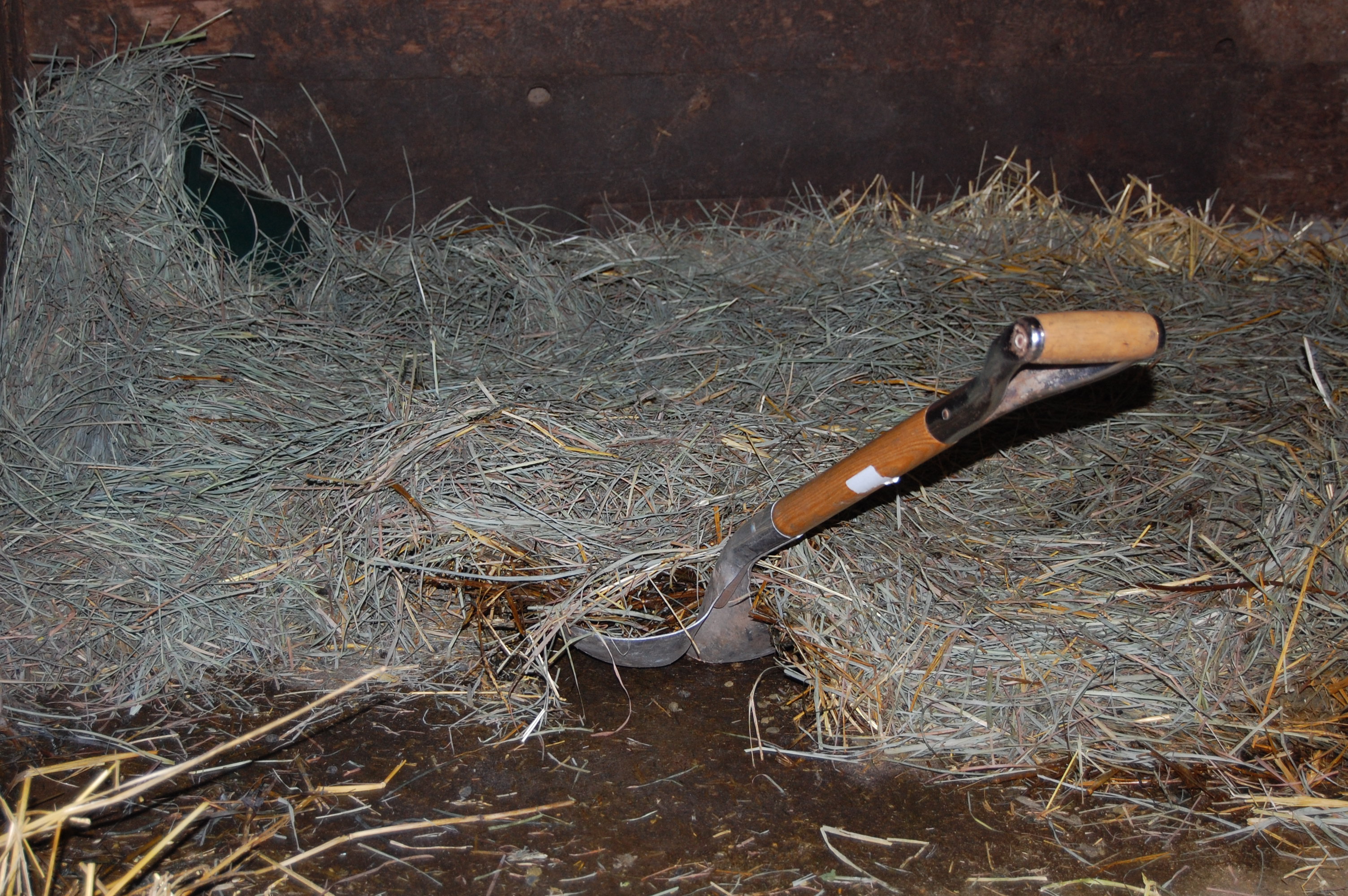 They had been in the stall almost one month. In one months time there wasn’t any composting going on but it was still heavy. I tried using the big shovel but as the matted straw was pretty stuck together and difficult to tear it worked better with a pitch fork.