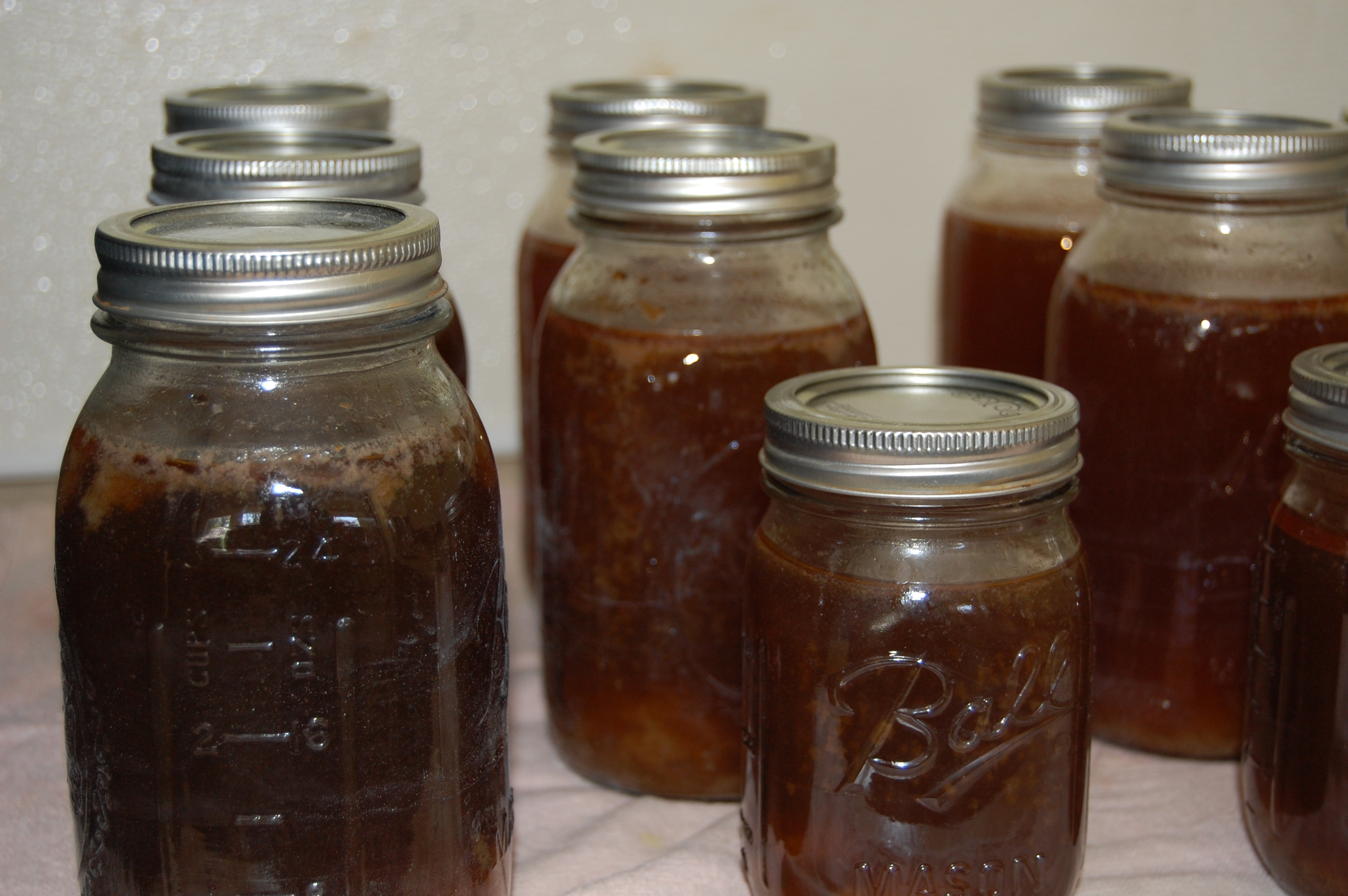 There is also the pressure canning. I’ve been meaning to use up some soup bones for a while now and thought I would take the opportunity to use my pressure COOKER to make the broth. I had to make it in three batches since I had nine pounds of bones. I just followed a Cooks Illustrated recipe from a pressure cooking cookbook they recently released. It went nicely. It took me two days to get the three batches made and then I pressure CANNED them today. Seven quarts and then two more pints. I forgot to put the vinegar in the canning water so my jars have a little white film on the outside. I have to put the vinegar in the water since we use well water. Never had to do that back in the city.